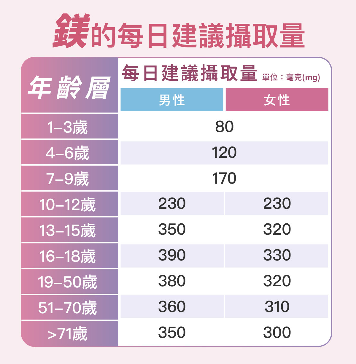 根據衛福部《國人膳食營養素參考攝取量(DRIs)第八版》,不同年齡、性別的鎂建議攝取量如下: