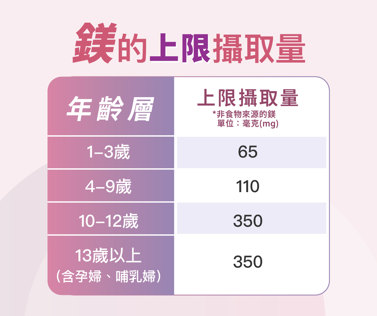 鎂的上限攝取量主要針對 非食物來源的鎂(例如保健品或藥物)訂定,因為一般從食物攝取過量的鎂會自然代謝排出。